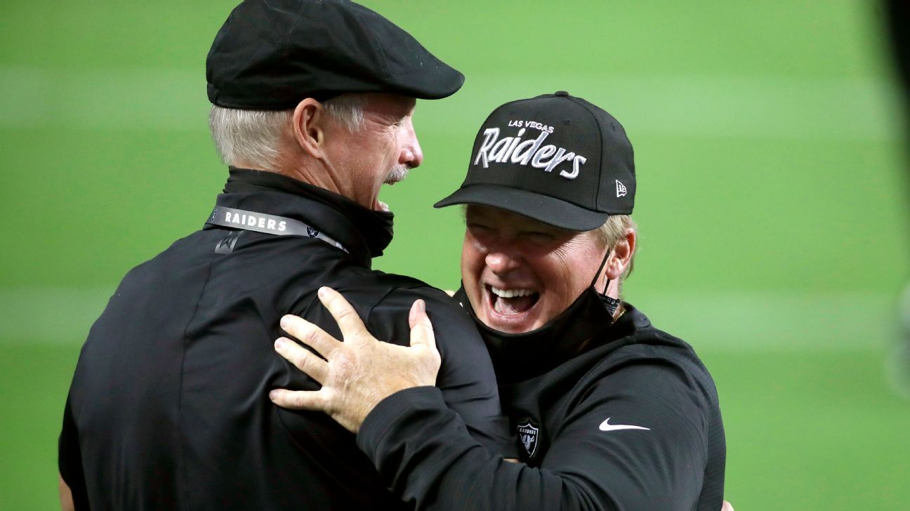 Las vegas raiders head coach jon gruden pumped up his team in the locker room following its 34 24 upset win over the new orleans saints on monday night football in week 2.